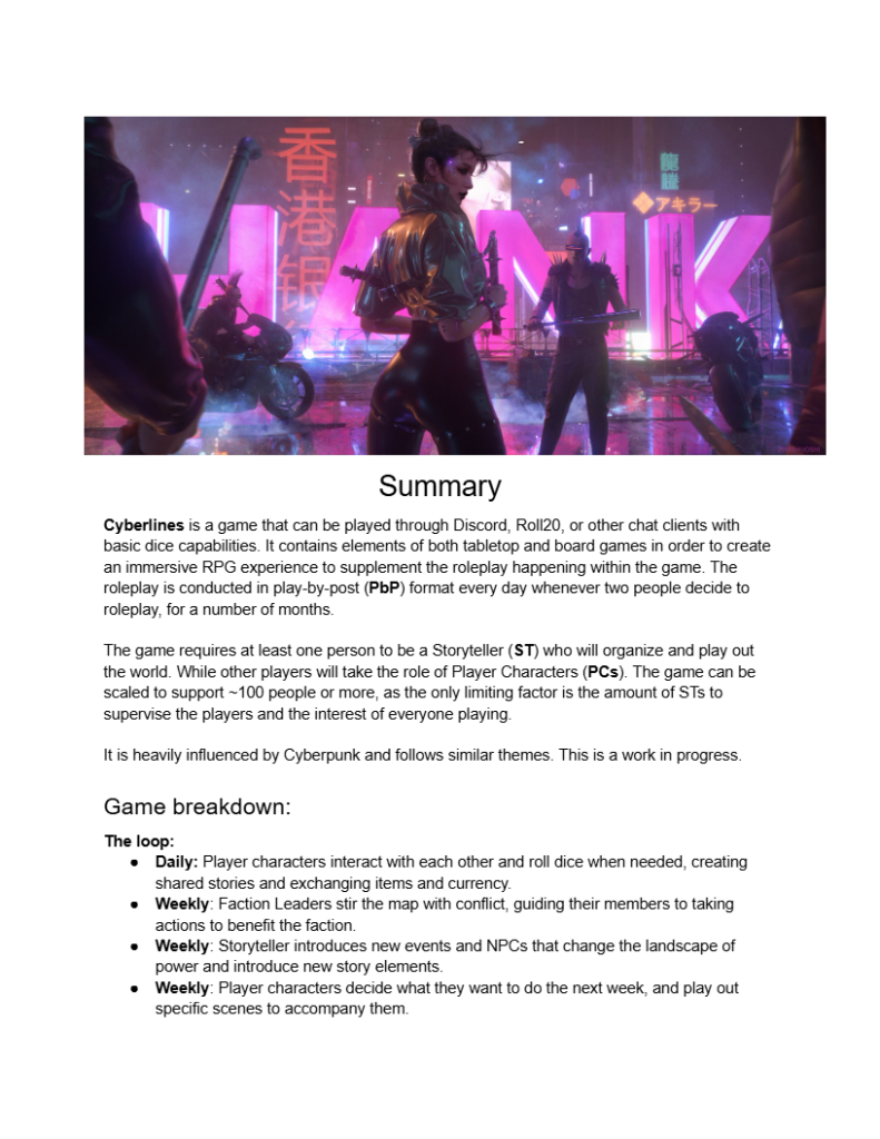 Tabletop RPG tailored for Discord, with weekly and monthly events. I organized and actively ran the server for 30 players in a play-by-post format, updating it for three months while leading all narrative events.