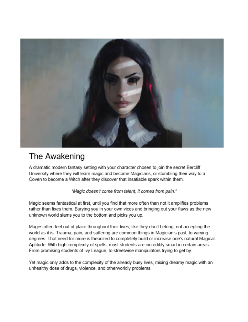 “You have been chosen by the University to join their magical program. Or you have stumbled upon a suspicious coven after discovering magic of your own. But beware, the world is dangerous and magic is going to make it even wilder.”